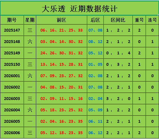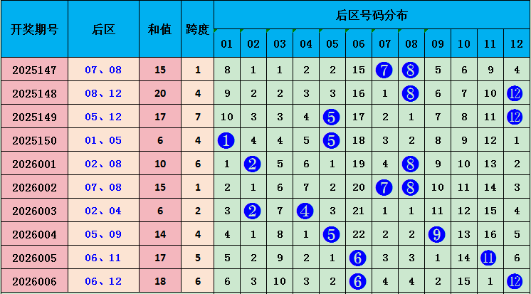 上期后区开出号码06 12,和值18,近十期和值15 20 17 6 10 15 6 14 17 18,和值波动范围较大,本期预测和值会下降,重点关注号码:07 10,和值17。