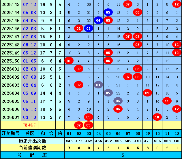 后区分析【一区01-04,二区05-08,三区09-12】:上期后区奖号为03和10,分别落在第一、三区,近50期后区三区比为30:39:31,近10期三区比为5:9:6,本期重防第一区号码大热,精选两码02+03。