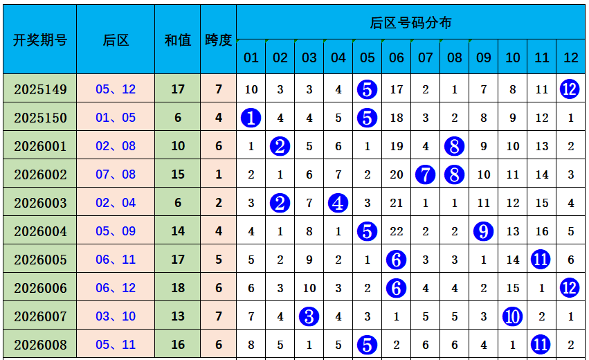 后区上期开出号码05、11,为奇奇组合,近十期后区奇偶比为10:10,奇偶数走势均衡,本期后区参考奇偶比0:2,重点两码推荐02、04。