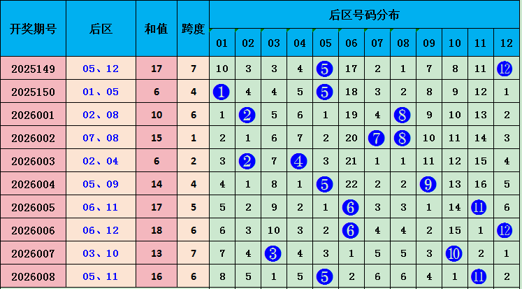 上期后区开出号码05 11,和值16,近十期和值17 6 10 15 6 14 17 18 13 16,和值波动范围较大,本期预测和值会下降,重点关注号码:04 07,和值11。