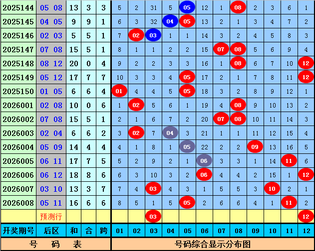 后区分析(一区01-04,二区05-08,三区09-12):上期后区开出奖号05和11,最近10期后区三区落号比为5:13:6,本期后区关注号码02、03、04、05、12,后区两码参考03、12。