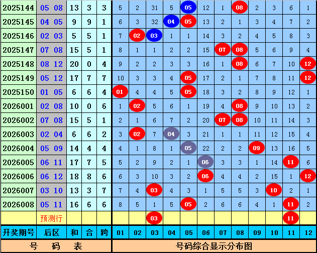 后区分析:上期后区开出两码05和11,分别遗漏了3期和2期,最近10期后区奖号大小个数比为9:11,奇偶个数比为10:10,本期后区注意号码03、05、07、10、11,精选两码03、11。