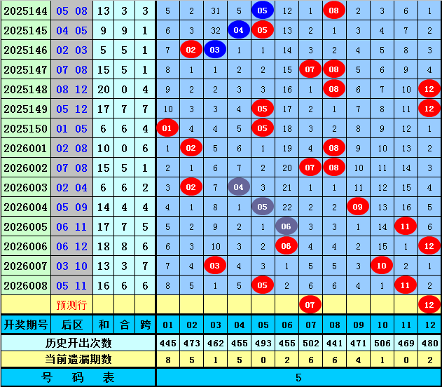 后区第一位推荐:在连续5期开奖中分别出号:05、06、06、03、05,均值为5.0,其中奇数奖号表现相对较热,本期没有转冷的迹象,注意再次出现,关注号码07。