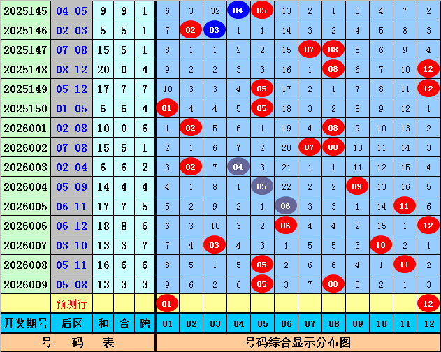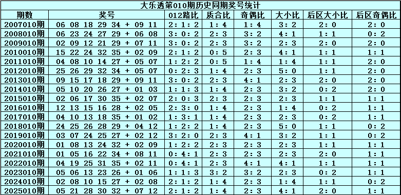 后区号码分析:第010期历史同期开奖中,后区两码一大一小开出10次,全大开出5次,全小开出4次,本期后区预计出现一大一小奖号,参考号码01、02、06、12。