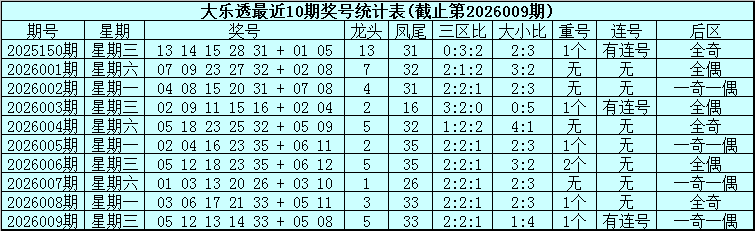 大乐透第2026009期奖号为:05、12、13、14、33+05、08。其中前区三区比为2:2:1,大小比为1:4,包含1个重号,包含连号,后区为一奇一偶号码。