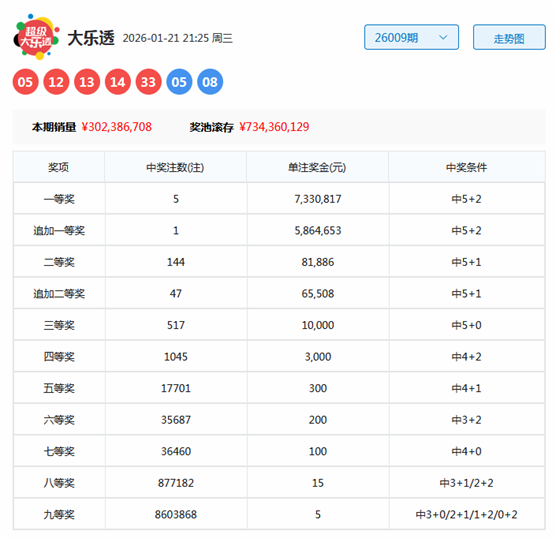 大乐透第2026009期开出奖号为:05、12、13、14、33+05、08。其中前区奇偶比为3:2,三区比为2:2:1,大小比为1:4,后区开出一奇一偶组合。