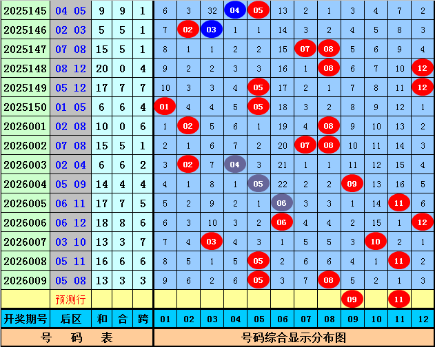 后区号码分析:上期后区开出奖号05 08,和值为13,跨度为3,本期后区参考号码02、04、09、11、12。