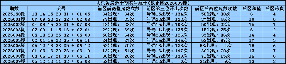 体彩大乐透第2026009期奖号为:05 12 13 14 33+05 08,前区号码大小比开出1:4,012路比开出2:1:2,奇偶比开出3:2,后区号码和值开出13,跨度开出3。