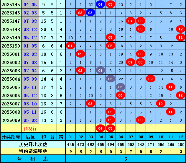 后区分析(定义:01-04为一区,05-08为二区,09-12为三区):上期后区开出奖号05和08,全在第二区出现,最近10期后区三个区间落号个数比为5:10:5,本期后区注意第一区和第二区号码出现,关注两码04、05。