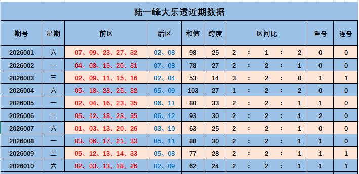 大乐透上期数据分析:前区02,03,13,18,26。后区02,09。前区和值62,跨度24,区间2:2:1,开出重号13。开出连号02,03。