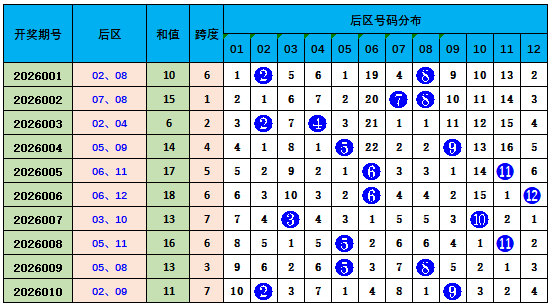 一区(01-12):上期开出2个奖号。最近10期该区开出20个号码,总体表现较热。本期该区关注2个号码02,12。