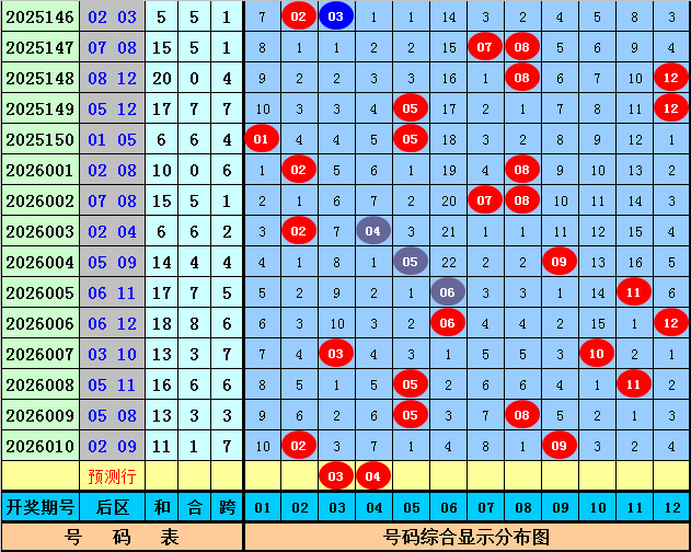后区分析(一区01-04,二区05-08,三区09-12):上期后区开出奖号02和09,最近10期后区三区落号比为5:13:6,本期后区关注号码03、04、05、07、10,后区两码参考03、04。
