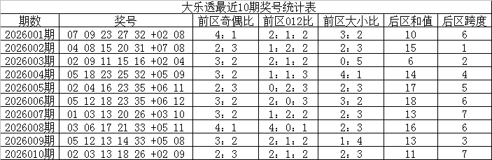 大乐透第2026010期奖号为:02 03 13 18 26+02 09。当期前区奖号012路比为2:1:2,冷热比为2:3,包含1个重号:13,包含连码组合02 03,后区开出一奇一偶、一大一小组合。