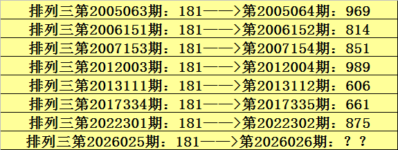 第2026025期排列三奖号为181,历史上该号码直选出现8次,下期奖号分别为:969、814、851、989、606、661、875。