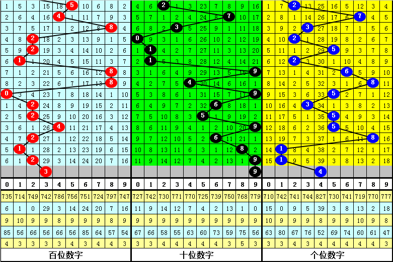 大中小分析:在组选0-9号码分布图中,前10期小 号(0-2区段)出现11枚奖号,中号(3-6区段)出现10枚奖号,大号(7-9区段)出现9枚奖号,上期中号区域没有落号,本期注意小 号走冷,防0-2区段断区。
