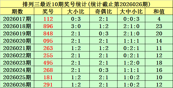 上期回顾:排列三第2026026期奖号为:291。奖号类型:组六,和值:12,奇偶比:2:1,跨度:8,大小比:1:2。