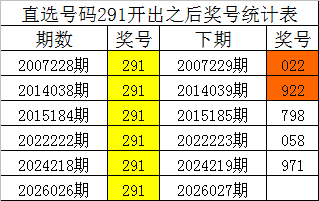 从上表统计可以看出,直选号码291开出之后,其下期奖号: