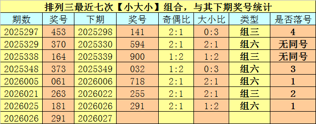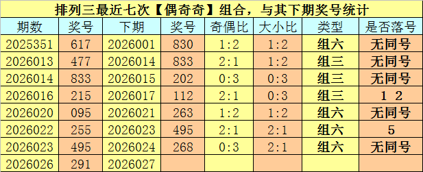 开奖回顾:排列三第2026026期开奖号码为:291。奖号类型为:组六,大小类型为:小大小,奇偶类型为:偶奇奇,包含重号:1。