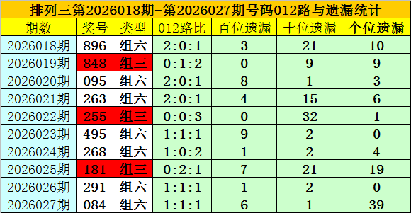 开奖回顾:排列三第2026027期奖号为:084,类型为组六,号码012路比为1:1:1,百十个位号码直选分别遗漏6期、1期和39期。