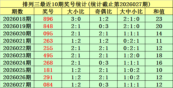上期回顾:排列三第2026027期奖号为:084。奖号类型:组六,和值:12,奇偶比:0:3,跨度:8,大小比:1:2。