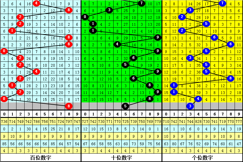 大中小分析:在组选0-9号码分布图中,前10期小 号(0-2区段)出现9枚奖号,中号(3-6区段)出现11枚奖号,大号(7-9区段)出现10枚奖号,上期大中小区间分别出现1枚奖号,本期注意小 号走冷,防0-2区段断区。