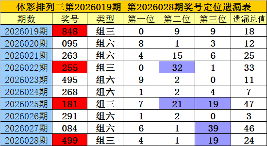 开奖回顾:排列三第2026028期奖号为:499,各位号码遗漏值分别为4、1、19,遗漏总值为24。