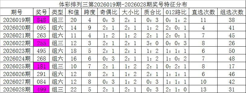 开奖公告:体彩排列三第2026028期开出奖号:499。组三,有重号:4,奇偶比2:1,大小比2:1,012比2:1:0,和值22,跨度5。