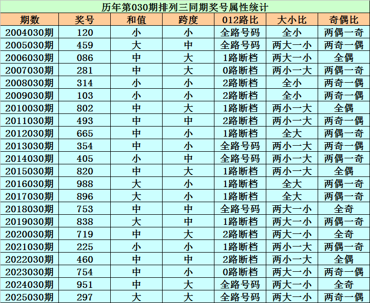 历史上第2026030期排列三已开出22期奖号了,历年同期奖号分别为:120、459、086、281、314、103、802、493、665、354、405、820、988、896、753、838、719、225、460、754、951、297,详细统计见下表: