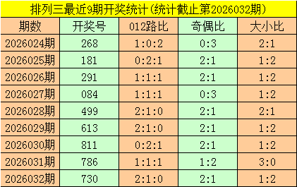 二、体彩排列三前9期奖号开出:268-181-291-084-499-613-811-786-730,其中奖号大小比为13:14,012路比为10:10:7,奇偶比为13:14;
