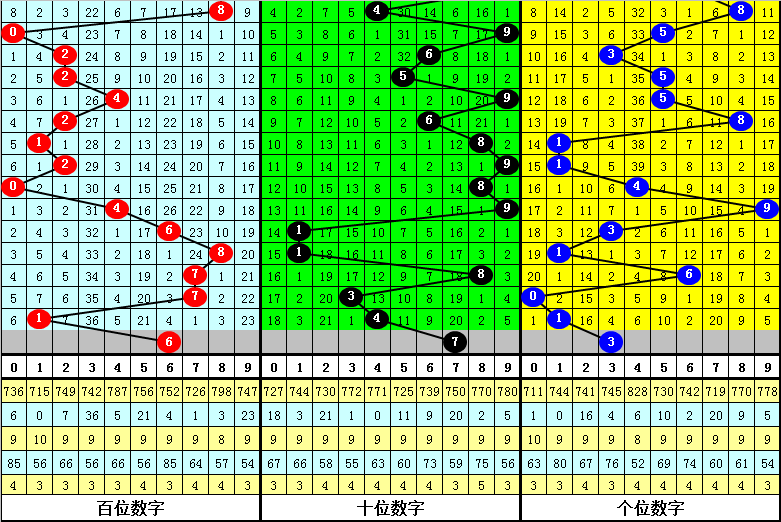 从以上统计可以看出,百十位两码合差5与3同时出现之后其下期两码合差表现最热的4个分别为:0124,本期百十位两码合差可以参考这四码中的数据。