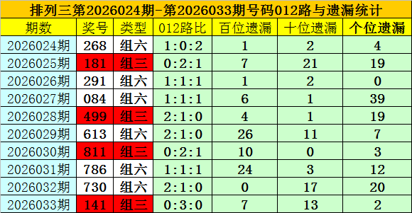 开奖回顾:排列三第2026033期奖号为:141,类型为组三,号码012路比为0:3:0,百十个位号码直选分别遗漏7期、13期和2期。