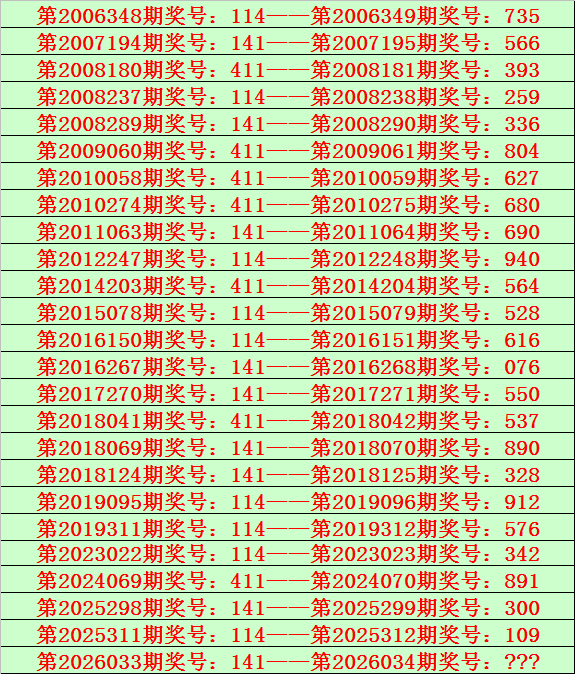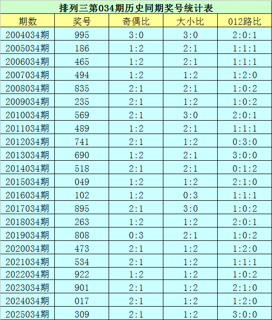 排列三第2026034期开奖日期:2026年2月3日,历史上第034期已开出了22次奖号,历年同期号码分别为:995、186、465、494、835、235、569、489、741、690、518、049、102、895、263、808、473、534、922、901、017、309。