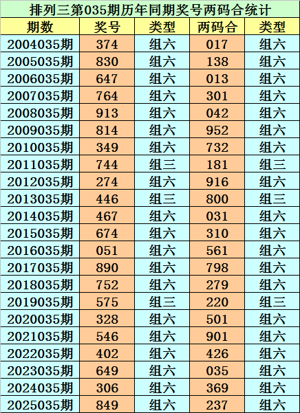 排列三第035期历史同期两码合分别开出:017、138、013、013、024、259、237、118、169、008、013、013、156、789、279、022、015、019、246、035、369、237;