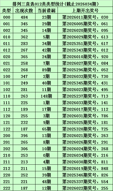 上期回顾:体彩排列三第2026034期开出奖号:216,其012路比为1:1:1,奖号012路类型为:210。