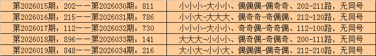 在排列三历史开奖中,第2026015期-第2026019期连续5期奖号为:202-215-112-896-848。
