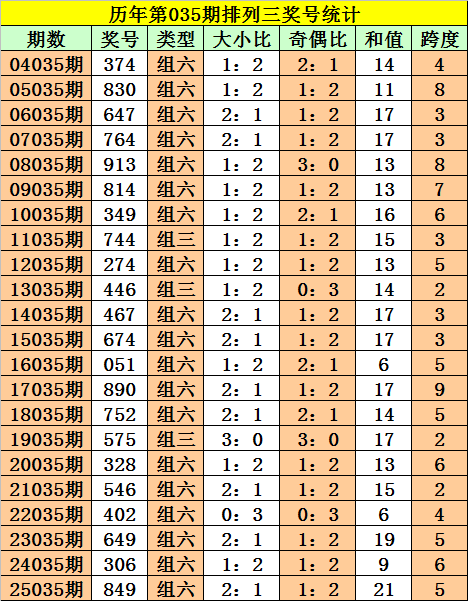历年第035期排列三奖号:374 - 830 - 647 - 764 - 913 - 814 - 349 - 744 - 274 - 446 - 467 - 674 - 051 - 890 - 752 - 575 - 328 - 546 - 402 - 649 - 306 - 849。