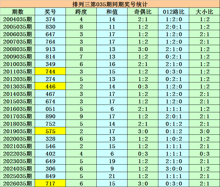 上期回顾:排列三第2026035期奖号为717,组选类型为组三,奖号大小比为2:1,012路比为0:3:0,奇偶比为3:0。