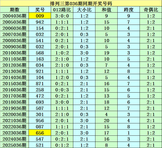 本期为排列三第2026036期开奖,开奖日期为:2026年2月5日,历史上排列三第036期已开出了22次奖号,历年同期开出号码分别为:009-942-154-032-541-032-568-163-034-921-104-871-258-472-693-507-301-956-087-656-547-521。