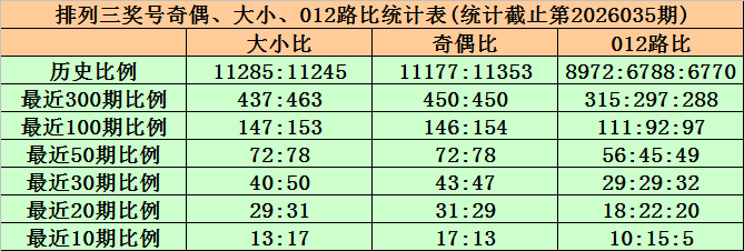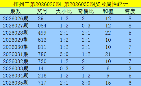 上期回顾:排列三第2026035期出现奖号717。开出组三,奇偶比3:0,012路比0:3:0,大小比2:1,和值15,跨度6。