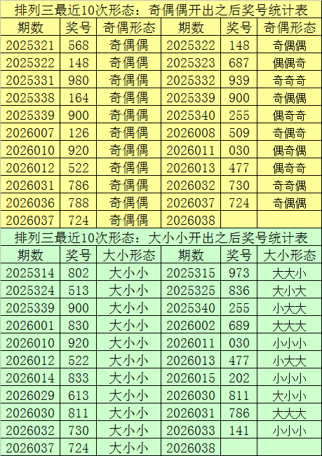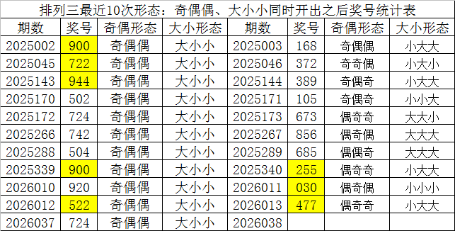 排列三最近10次同时开出奇偶形态:奇偶偶和大小形态:大小小时其奖号分别为:900-722-944-502-724-742-504-900-920-522-724,下期分别开出号码为:168-372-389-105-673-856-685-255-030-477,详细统计见下表: