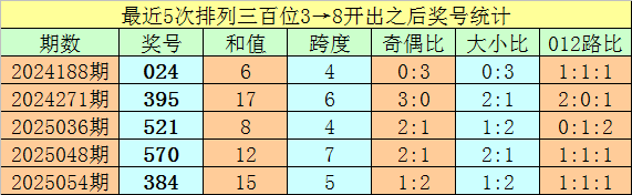1、排列三最近两期百位号码分别开出3和8,历史上百位号码连续两期分别开出3和8的奖号出现了96期。前五期开出之后其下期奖号分别为:024、395、521、570、384;