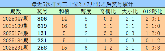 1、最近两期排列三十位号码开出号码分别为2和7,历史上十位号码连续两期同时出现号码2和7的奖号共开出71期。最近五次下期开出号码为:806、619、131、221、258;