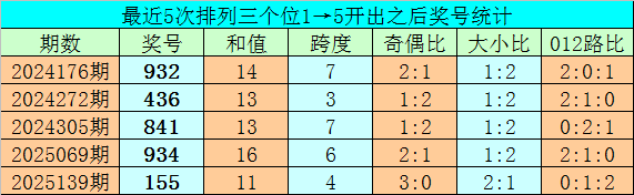 1、排列三前两期个位分别开出号码1和5,历史上个位号码连续两期分别出现1和5时,共有66次。在最近5次出现时,其下期分别出现号码:932、436、841、934、155;