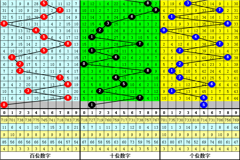 3、在以上0-9号码频次中,号码大小比为41:54,012路比为33:30:32,本期预计百位开出0路号码,参考号码0。