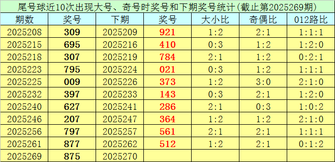 在尾号球前10次开出大号、奇号类型之后,其下期分别开出奖号:921、410、784、021、373、143、286、364、561、512,其中号码奇偶比为5:5,大小比为1:9,012路比为4:5:1。