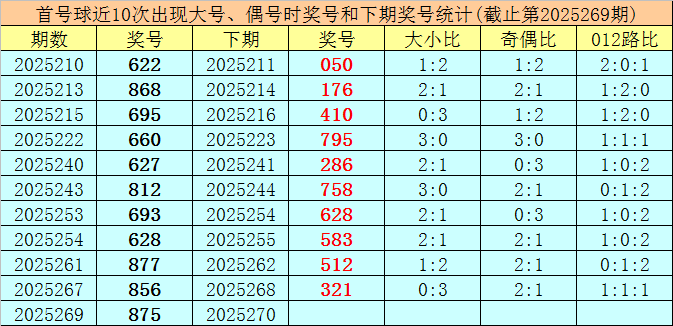 在首号球前10次开出大号、偶号类型之后,其下期分别开出奖号:050、176、410、795、286、758、628、583、512、321,其中号码012路比为3:4:3,奇偶比为6:4,大小比为5:5。