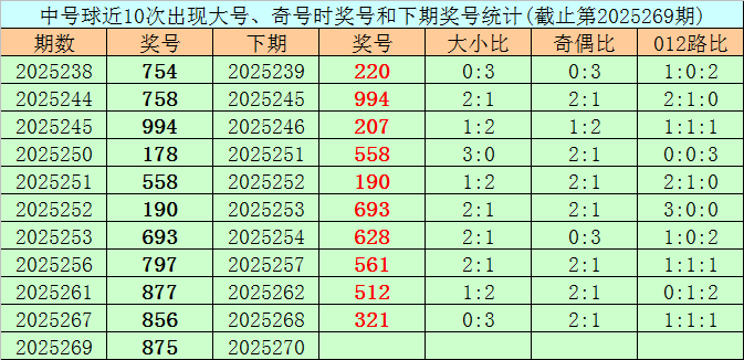 在中号球前10次开出大号、奇号类型之后,其下期分别开出奖号:220、994、207、558、190、693、628、561、512、321,其中号码012路比为5:1:4,奇偶比为5:5,大小比为5:5。