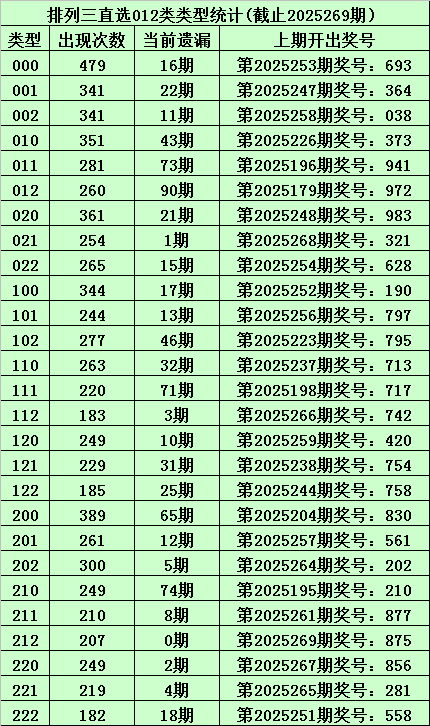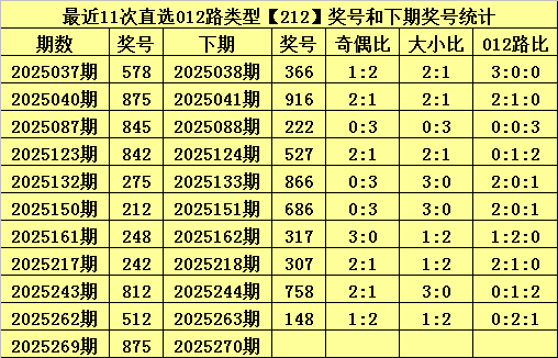 上期回顾:体彩排列三第2025269期开出奖号:875,其012路比为0:1:2,奖号012路类型为:212。