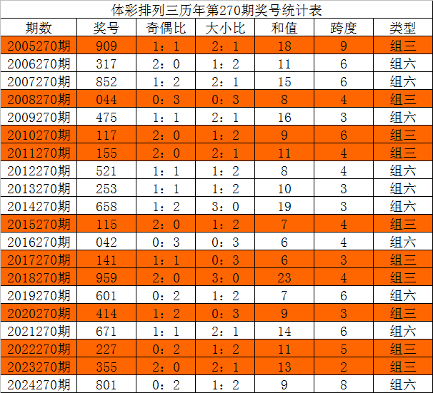 体彩排列三历年第270期开出奖号分别为:909、317、852、044、475、117、155、521、253、658、115、042、141、959、601、414、671、227、355、801。统计详见下表: