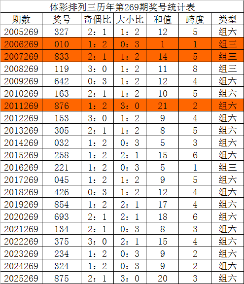 在历年排列三第270期开奖中:组三号码出现10次,组六号码出现10次。组六号码开出比例略低,本期奖号形态看好:组六号码。